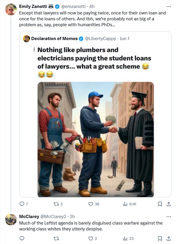 Student loan bailouts are not only a way to buy the votes of indebted recipients of increasingly irrelevant degrees, but also a way to shore up Academia. Bailouts stave off any reckoning Big Academia would otherwise face for peddling unmarketable, irrelevant degrees. Bailouts insulate universities from any need to trim bloated bureaucracy, and make it possible for hothouse ideologies (Marxism, Trans nonsense, DEI absurdity) to flourish; when those tender ideologies would wilt and wither if exposed to the real world outside their incubator in academia.