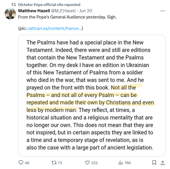 The Old Testament is to be read through the eyes of the New, but not summarily discarded. Even the Douay-Rheims footnotes cautioned against taking the imprecations in some of the Psalms as permission for cursing or revenge among Christians. But we all know what’s going on: libs who want sexual license approved by the Church. Begin with cancelling selected and misread Psalms so you can end with cancelling the Sixth Commandment.