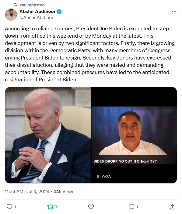 The other big problem with resignation is that it’s impossible to do without at minimum admitting that Biden is grossly incompetent, and it will probably force them to admit that his family is a bunch of criminals. That’s too much loss of face. If they merely replace him as the nominee they can put a positive spin on things, i.e. “We had 4 good years under Biden but now we need to let a new generation bring fresh ideas to the nation.” If he resigns then the new candidate can’t avoid talking about how Biden messed up, but he will be different; but that only confirms the narrative from Donald Trump and his supporters, and so also confirms that the media was lying for years. Not an easy place to win an election from.