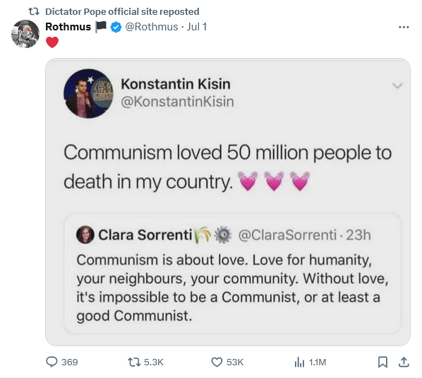 How far gone do you have to be to believe communism is about “love”?