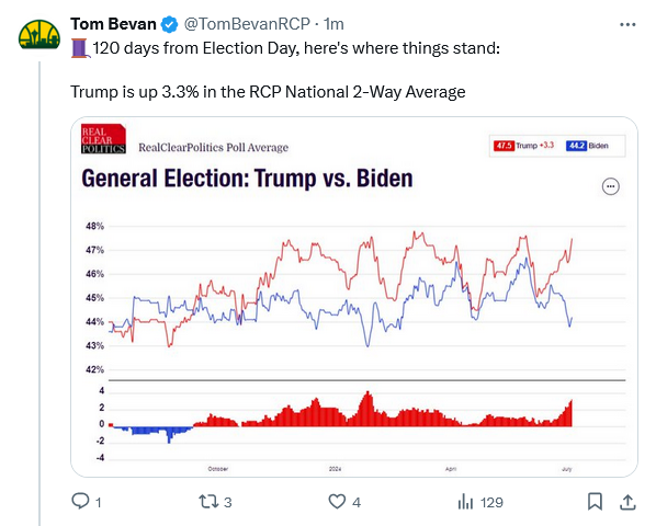 It should be recalled that the aggregate polls in 2020 had Biden ahead by 7.2 points prior to election day. Biden won by 4.5 points, demonstrating that the polls underestimated Trump’s strength by 2.7 points. Of course these current 2024 numbers are made up almost entirely of polls taken prior to the debate.