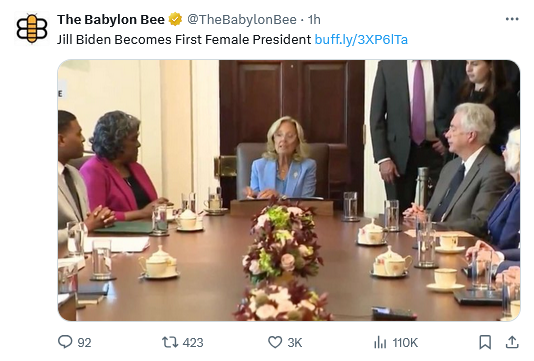 According to media reports, Dr. Biden showed true leadership when she manipulated her senile husband into letting her run a cabinet meeting, where she promptly invoked the 25th amendment to have him removed from office.