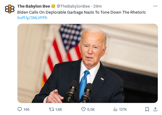 The president stressed the need to leave insults behind and for the nation to return to civility. “The idea… that these sewer-dwelling, racist, woman-hating, fascists would try to infect our democracy with such vile, and by the way!” Biden continued. “They’re the worst. The absolute scum of the earth. Walking pieces of human scat. But this is a time for unity. When we can come together… as one people… all of us… along with the hideous, festering, buckets of slime who support Donald Trump… to unite this country. And that’s… that’s the… that’s it. End speech.”