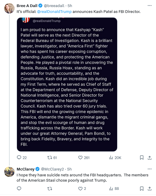 Also, so far Patel is running on the “deep state” agenda which is undoubtedly true. But what does the new FBI look like? You need an internal law enforcement body higher than the police force for national intel and security. Particular in a nation like the US which has a population of over 346 million people.