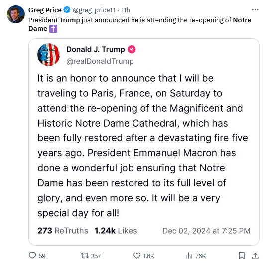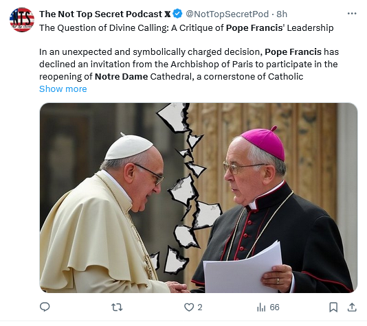 I think Bergoglio, who is very vain, did not want to appear at Notre Dame, sitting, obviously incapacitated even in a wheelchair, alongside a very vibrant and strong President Trump. PF refuses to acknowledge his declining state and wants to hold on to power, unlike his much maligned predecessor, and like every Leftist does, until the last minute of life, clutching the drapes as they carry him out to the funeral home.