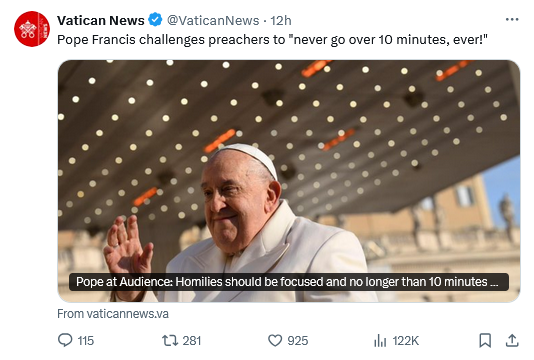 Absolutely true. The 60s and 70s era priests were basically looking for an easy job and a male Centric environment. Most of them were bad homilists preaching the gospel similar to what the pope open often preaches which sadly often doesn’t include Christ. For those not good homilists 10 minutes is too long. There are exceptions. We have a millennial pastor, and his homilies are regularly 20 minutes and I have rarely been aware of how long the homily was. He has a gift many don’t have though.