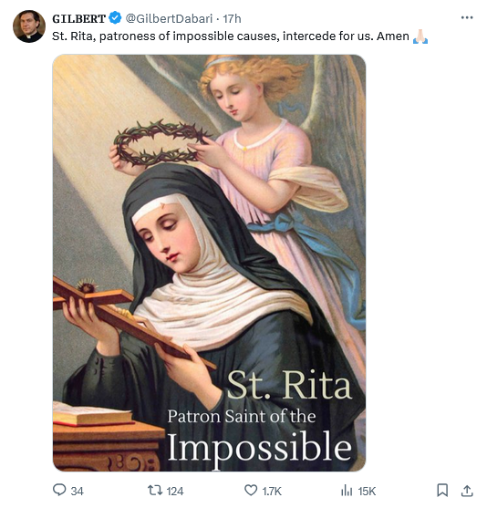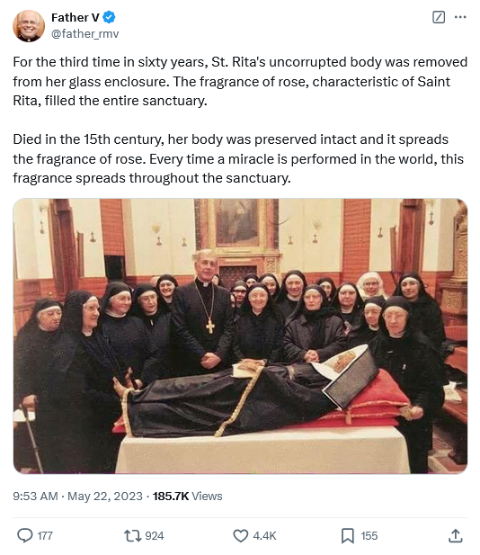 ST. RITA OF CASCIA, whose feast is celebrated on May 22, was born at Rocca Porena, Italy, about the year 1386, and died at Cascia in the year 1456. Her parents opposed her desire to become a nun, and persuaded her to marry a man who, in a short time, lost his reputation on account of his cruelty. After being converted from his wicked ways, he was murdered by an enemy. Rita’s two sons then resolved to take revenge, but through her prayers they repented. After their death, she applied several times for admission into the Augustinian Convent at Cascia. Repeatedly refused until God Himself cleared away all obstacles, she entered the convent, made her profession and lived the life of a holy and devout Religious for forty-two years, “a shining example of every Christian virtue, pure as a lily, simple as a dove, and obedient as an angel.” That “God is wonderful in His Saints” is easily proved in the life of St. Rita, and, owing to her great number of miracles, she is often styled “The Saint of the Impossible.”