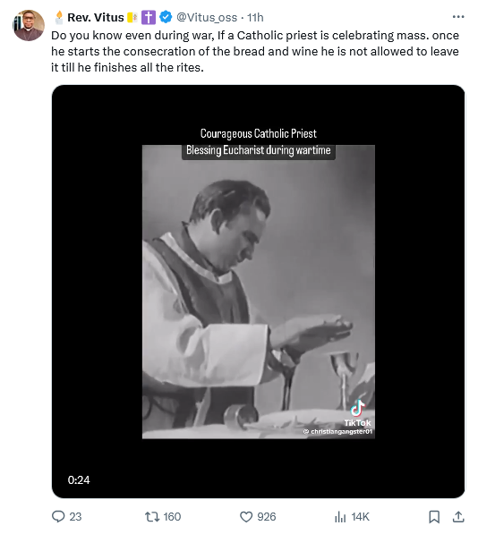 The Eucharist is no religious service, but the Priest, through the power of God, making The Second Person of the Trinity manifest among us. What the Priest is doing at that moment is more important than anything else going on in this Vale of Tears.
