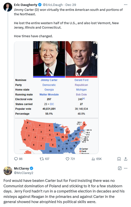 Reagan nearly defeated Ford. I watched the GOP convention in 1976 and was fascinated by it. Ford’s comments about the Soviet bloc were indeed stupid. My parents were Democrats who disliked Nixon intently. I allowed my parents’ views to convince my self that a Democrat controlled government would make things better, but the opposite occurred. Carter was a terrible president and I don’t think he ever got over losing so badly to Reagan.