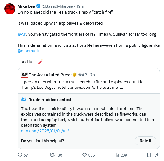 Now there is a report from the NY Post that the Vegas perp was actually a Trump supporter and that his suicide was triggered by his wife finding out he had (allegedly) cheated on her and demanding a divorce. He may even have chosen a Cybertruck in order to prevent any bystanders from being harmed: