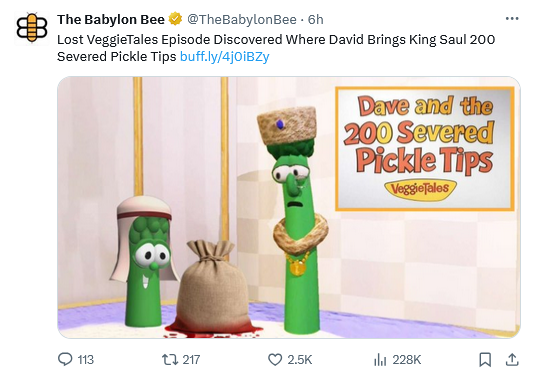 TUSTIN, CA — A previously lost episode of the beloved children’s classic VeggieTales has surfaced that depicts a young Dave, portrayed by Junior Asparagus, chopping off 200 pickle tips and bringing them to King Saul as tribute.