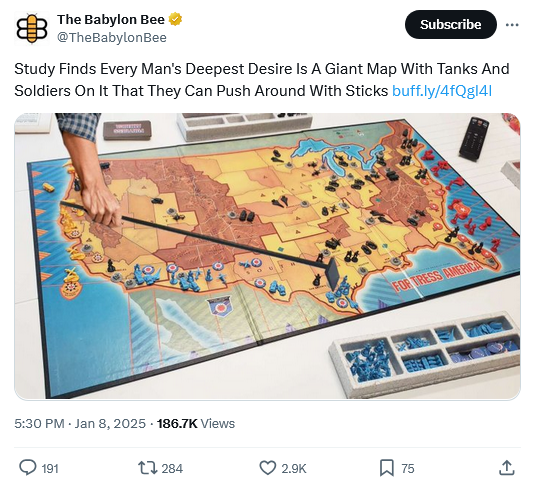 Though men expressed other significant desires, such as having children or producing meaningful work, the yearning to push small army men around on a map outstripped all others.