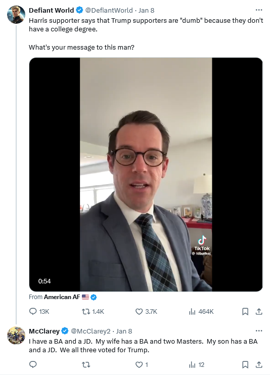 As to the unnamed Harris supporter, she would have said that needing to tell people how many degrees you have is proof of an insecure person without real accomplishments.