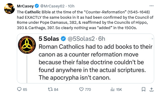 It is interesting to note that at least since the holidays Protestantism has been going on the offensive at Twitter / X, and getting its proverbial hind quarters handed to it. Also, the Twitter / X feed for @5Solas2 whom @MrCasey is debunking in Donald’s post has apparently disappeared. BTW, I highly recommended following Mr. Casey here: