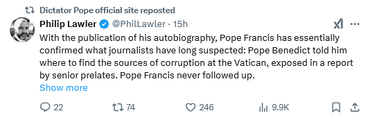 Go here to read about it. Pope Benedict was probably one of the brightest men to be Pope. Yet he lacked the guts to root out the corruption at the Vatican, seeking to have this cup passed from him by resigning and have his successor fight the battle, which Pope Francis, that living embodiment of corruption, of course declined to do. Popes being intelligent is good; popes having courage is better.