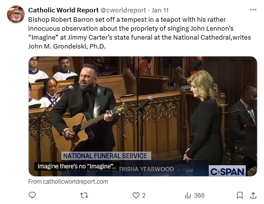 Go here to read the story. Crappy song; crappier message. Supposedly it was performed at the funeral because it was one of Jimmy Carter’s favorite songs. De mortuis nihil nisi bonum so Popewatch will pass in silence the musical taste, or lack thereof, of our late President. However, the restraint of PopeWatch does not apply to you dear reader.