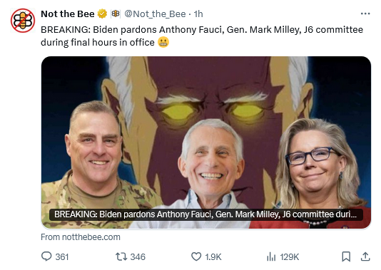 Biden has pardoned the members of the January 6 committee, Doctor Fauci and General Mark Milley. This of course removes their ability to plead the Fifth before Congressional investigating committees or in regard to DOJ investigations. The pardons do nothing to insulate them from civil law suits. I don’t think we have ever had a more lawless administration.