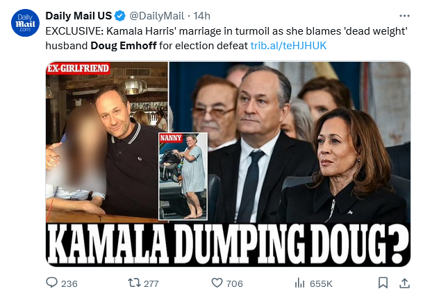 You have to read the British tabloids to learn what is going on in this country if the news in question is bad for the Democrats. Go here to read the story. Well Emhoff was certainly as little help to her in the campaign, as Walz was, but the one thing that rings true about this poorly sourced story is that Harris will blame everyone, other than herself, for her loss and that she is delusional enough to try again in 2028. I would love to see her go against Vance in 2028. Harris of course lost the race all by herself after blowing a billion and a half, an almost five to one money advantage. Lets see if the Democrat donors are stupid enough to pony up that type of cash again.