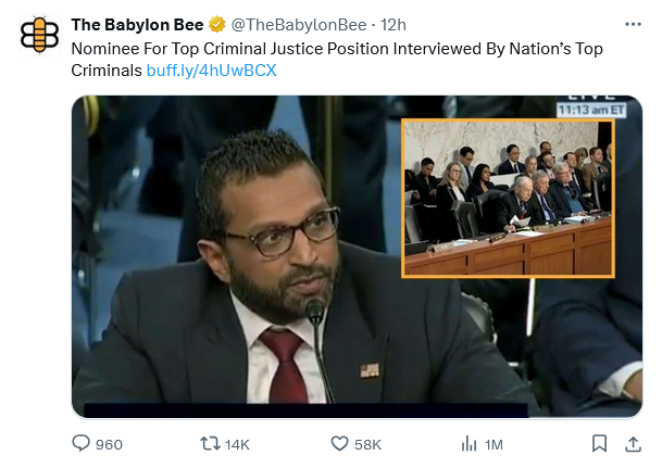 “I have serious concerns about your character, Mr. Patel,” said Senator Whitehouse, a notorious DC criminal. “Based on things you’ve said in the past, it seems you want to turn the FBI into a law enforcement agency to be weaponized against criminals. I find this unsettling and deeply disqualifying.”