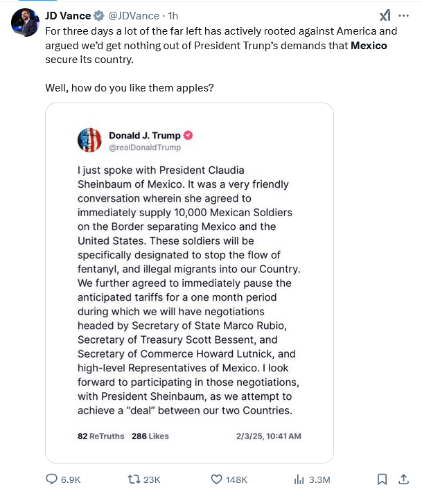 Well done, DJT! It is a relief to have a president who takes the security of this country seriously, and who doesn’t back down when it becomes necessary to do so. And I am grateful for President Sheinbaum, who has recognizes it is in the best interests of Mexico to cooperate with the legal, reasonable requests of the US Government. I hope Prime Minister Trudeau comes to the same conclusion.