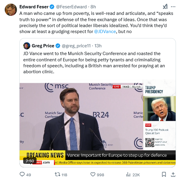 A spectre is haunting Europe: conservative populism. In the name of combating that terrible menace, European governments have practically eliminated freedom of speech. They have shackled their economies with onerous and impoverishing regulations in order to fight the phantom emergency of climate change. They are being inundated with Islamic illegal aliens, and anyone who notices the crime and violence they bring in their wake is tarred with being a racist. They fully embrace the sad farce of wokism. JD Vance represents what they fear most: electoral defeat by conservative populist parties at the hands of their increasingly restive populations. What they really should be fearing is what President Kennedy said almost 63 years ago: Those who make peaceful revolution impossible, make violent revolution inevitable.