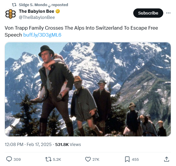 SALZBURG, AUSTRIA — The well-respected Von Trapp family has reportedly fled across the alps to Switzerland to escape the ever growing threat of free speech.