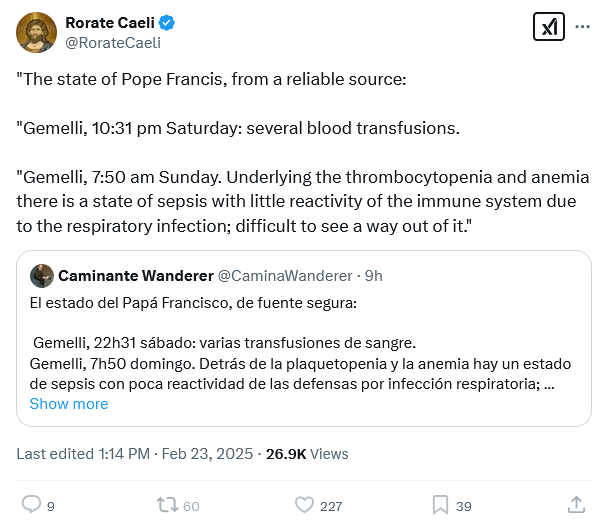 Praying he will die in a state of grace and that Our Lord will have mercy on us and let us have a holy and faithful and strong next pope who will be as a “Trump” and work to restore the Church.