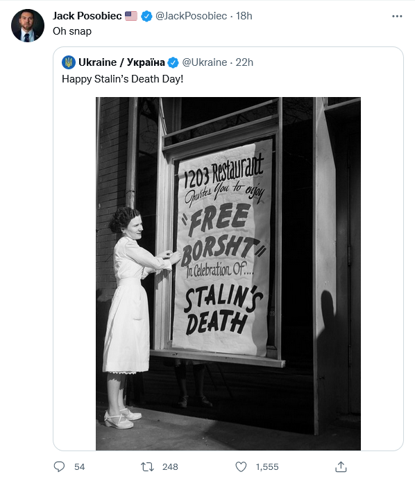 That is blackening the coal. Stalin’s major stroke on March 1 left him unresponsive. According to his daughter, Svetlana, just before his death he opened his eyes and gestured with his left arm, but she wasn’t sure what he was gesturing to. His eyes, once again according to his daughter, seemed to indicate a fear of death.