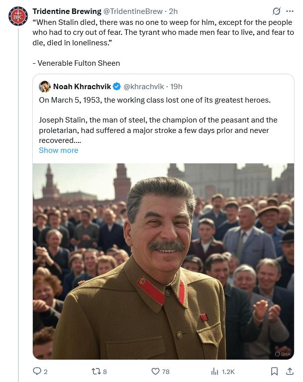 My Mother’s parents fled Ukraine, escaping Stalin’s engineered famine— the Holodomor— that killed millions. I cannot imagine what they would think of some comfortable, free American like Noah Khrachvik spouting nonsense like saying Stalin was “the champion of the peasant and the proletarian”.