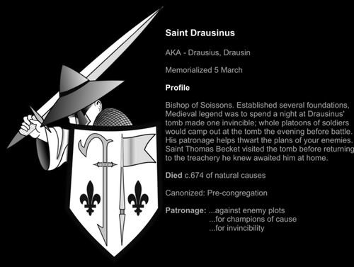 Bishop of Soissons, France, also called Drausius. Educated by St. Anseric, Drausinus fostered monastic life in his diocese. He built a monastery at Rethondes, two churches, and a convent at Soissons. Drausinus’ shrine was visited by St. Thomas Becket just before his own martyrdom.