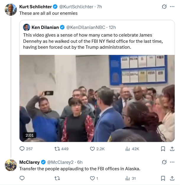Yesterday my wife and I got our taxes done and the tax account doing them turned out to be a Democrat. We’ve been going to him for years because he is competent and efficient. But I never knew his political leanings until he initiated the conversation by remarking on DOGE, the FBI, etc. He fully supported Dennehy’s disobedience as heroism in the face of tyranny. He compared Trump to Hitler. Now don’t get me wrong. He is no stupid nor ignorant man. He knew when Caesar was assassinated, the names of the men of the Second Triumvirate, what the Federalist Papers are, etc., all things that typical post-modern neo-pagans in the Democrat Part are blissfully unaware. But my point is this: the man is intelligent and well-read, however, he hates Trump with an undying passion and he represents almost half the country, including people like Dennehy’s supporters. This is NOT going to end well because these people see politicians like incompetent idiot Kamala Harris as good, and men like Donald Trump as intrinsically evil. BTW, I said and did nothing to let my tax accountant know my politics. I made the usual conciliatory noises because I wasn’t interested in an argument with the man who was saving me money.