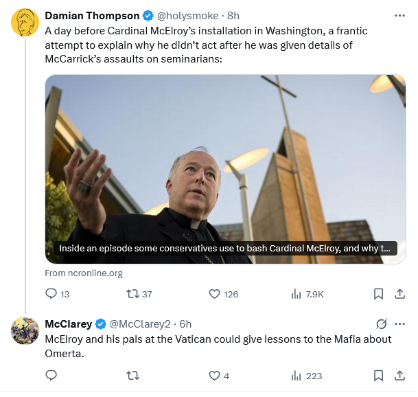 It has been my contention for some time that as long as Ted McCarrick is still alive, they need someone who is going to keep things covered in DC. I actually thought McElroy was going to be the guy back when Wuerl resigned, but they put in Gregory, figuring they’d eventually turn to McElroy. And they have. Omerta is absolutely the right analogy here.