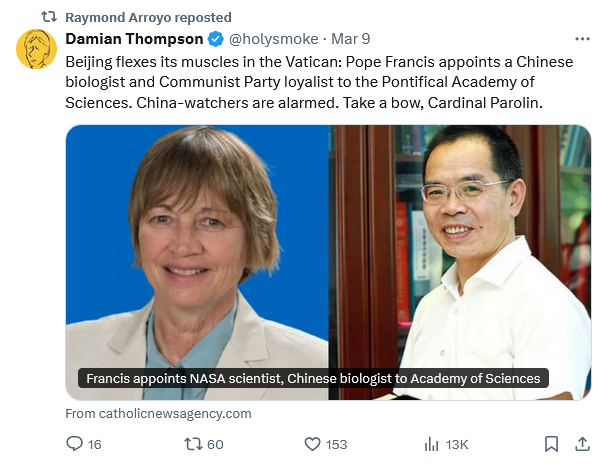Dr. McClung, I offer the clerics of the Vatican the one finger submarine sailor salute. The Chicoms can make due with being on the receiving end of Mark-48 torpedos. 😉