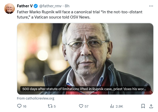 And finally, according to a source close to the Vatican, Father Rupnik is to be tried under the canonical crime of “spiritual abuse” and “false mysticism” — a crime mentioned during the Nov. 22, 2024, audience of Cardinal Victor Manuel Fernández with Pope Francis and published in a “foglio,” or summary of the discussion, by the Vatican. “The sentence is expected in the not too distant future,” the source told OSV News.