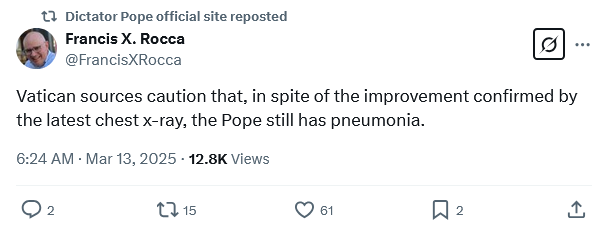 […] Francis:PopeWatch: Long Pneumonia – Donald R. McClarey, J.D., at the American CatholicLow Lights of a Pontificate – […]