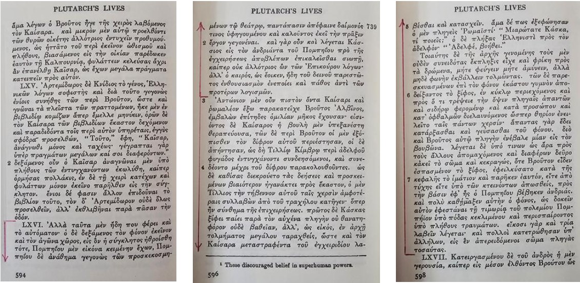 Well, then, Anthony, who was a friend of Caesar’s and a robust man, was detained outside by Brutus Albinus,​ who purposely engaged him in a lengthy conversation; but Caesar went in, and the senate rose in his honor. Some of the partisans of Brutus took their places round the back of Caesar’s chair, while others went to meet him, as though they would support the petition which Tullius Cimber presented to Caesar in behalf of his exiled brother, and they joined their entreaties to his and accompanied Caesar up to his chair. But when, after taking his seat, Caesar continued to repulse their petitions, and, as they pressed upon him with greater importunity, began to show anger towards one and another of them, Tullius seized his toga with both hands and pulled it down from his neck. This was the signal for the assault. It was Casca who gave him the first blow with his dagger, in the neck, not a mortal wound, nor even a deep one, for which he was too much confused, as was natural at the beginning of a deed of great daring; so that Caesar turned about, grasped the knife, and held it fast. At almost the same instant both cried out, the smitten man in Latin: “Accursed Casca, what are you doing?” and the striker, in Greek, to his brother: “Brother, help!”