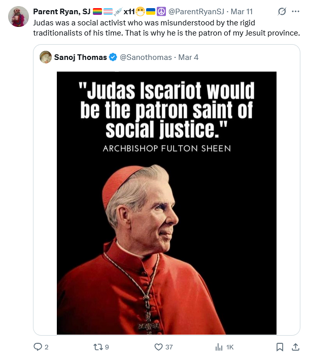 A new low. Parent Ryan, SJ: [Judas Iscariot] is the patron saint of my [Jesuit] province.”