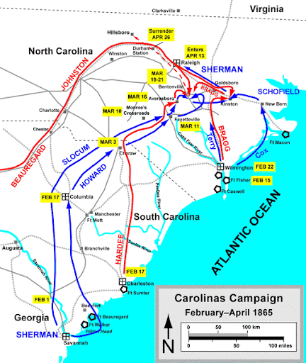 Johnston realized that militarily the situation was beyond hopeless, but hoped that he could delay Sherman in his invasion of North Carolina, and win enough tactical victories, that when the time came for his surrender, he and his army would receive decent terms from Sherman.  With this sense of realism, Johnston once again began the task of attempting the military equivalent of making bricks without straw or mud.