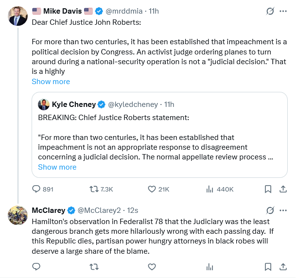 Apparently that district court judge who is at the center of the current fracas is also the one whom Roberts appointed as head of the FISA Court, so there’s more here than just “looking out for the judiciary”; this is also Roberts covering his own tracks and there’s also probably some kind of blackmail going on, not dissimilar from when Roberts magically determined that the Affordable Care Act was a “tax”.