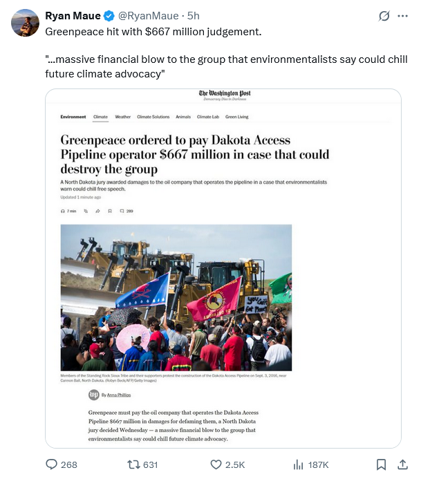 I don’t care for Greenpeace, but I’m dubious about bankrupting people with punitive damage awards. I’d be pleased to see that happen to whomever is financing Antifa, financing the shysters attempting to impose a regime of open borders, financing the hideous lawfare campaign against DJT and his associates, and promoting vote fraud. (And I’m assuming that all roads lead to Soros). I’m not seeing Greenpeace as a criminal organization, just a bunch of pests.