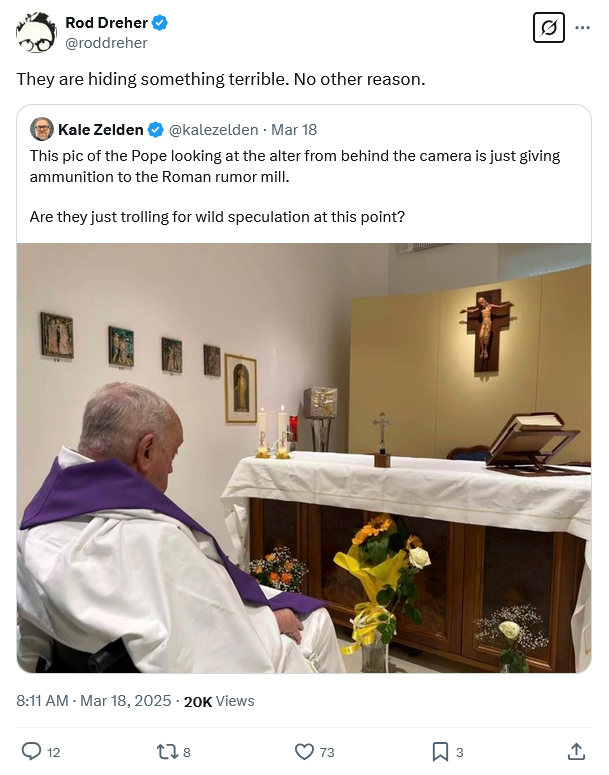No clue what Dreher fancies ‘something terrible’ might be. Francis is an 88 year old man with a set of infections commonly lethal to the very old. I doubt it would surprise anyone to learn he was non compos mentis due to his ailments or the medication regimen.