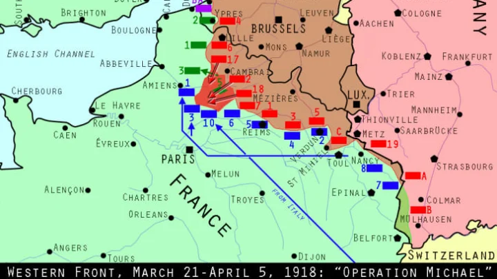 By the time the offensive came to an end on April 5, 1918 the Germans had put a scare into the Allied High Command and made huge, up to 65 miles, almost unbelievable, in the context of the Western Front, gains against the British. However, there were worrisome factors for the Germans to contemplate. Each side during the offensive lost a quarter of a million men, but the German losses were mostly among their highly trained, and irreplaceable, stormtroops. The Germans enjoyed huge tactical successes, but General Ludendorff, perhaps the most overrated commander of the Great War, was unable to use these successes to gain the strategic goal of separating the British from the French. The Germans had great difficulty in keeping their assault troops supplied over the torn up terrain they were advancing over. The Germans captured 75,000 British troops, and 1300 pieces of artillery, but they were no closer to ultimate victory than they had been when Operation Michael was launched.