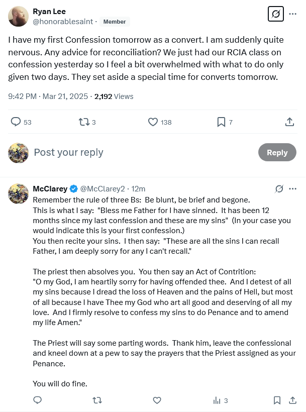 “I have my first confession tomorrow…. We just had our RCIA class on confession yesterday.”