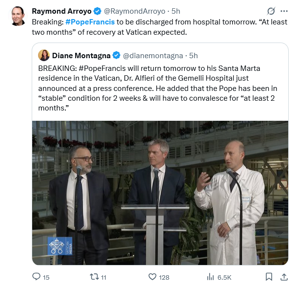 PopeWatch is not a fan of Pope Francis, to say the least.  It is a pity however that Pope Benedict, who resigned for reasons of health, did not possess a fraction of the gumption that Pope Francis has shown with his various ailments over the last 12 years.  Now we will see just how physically, and perhaps mentally, Pope Francis has been afflicted from his fight with pneumonia.  A Cardinal made the curious statement that the Pope would have to relearn how to talk.
