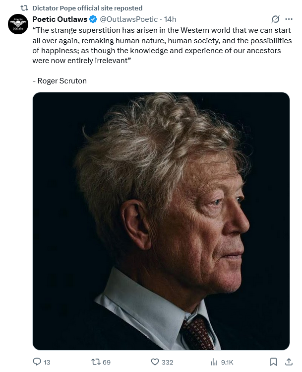 Scruton seems to have predicted the Modernist church and our Kidney Stone Pontificate in all their secularized foolishness.