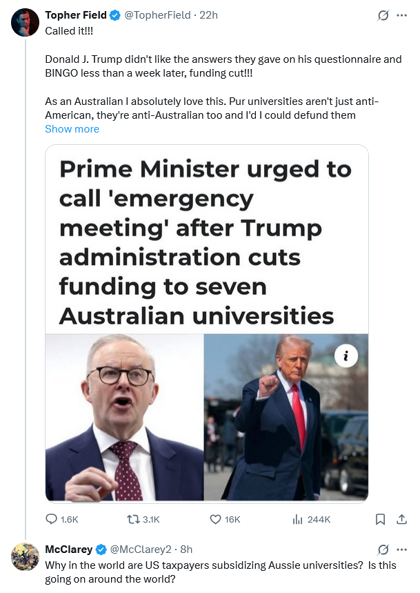 Yes. Donald McClarey, why are American tax payers funding Australian universities? My grandchildren are still paying off their student loans.