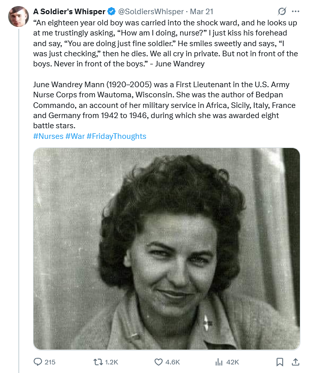 God bless her. Donald McClarey you beat me to it. Her story is in World War II in HD by Gary Sinise, as very worthwhile watch.