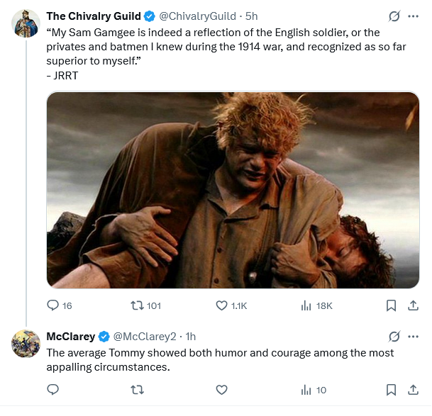 Tolkien was a combat veteran of the Western Front. He noted that by 1918 almost all of his friends were dead. CS Lewis also was a combat veteran of the Western Front, and he expressed similar sentiments about the men he commanded: