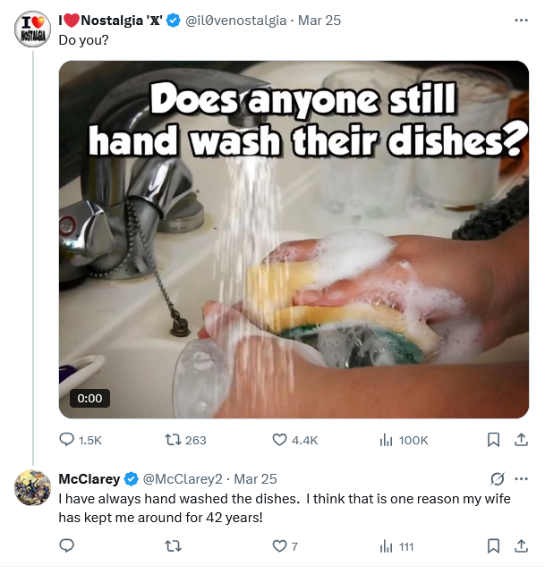Advice to my fellow men: doing the dishes is an excellent way to bring a most attractive sheen to the eyes of most wives, at least judging by the envy other women have expressed when my Bride notes that I happily do the dishes.