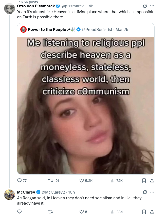 That seems to fall under the meme that says ‘Tell me you know nothing of communism, religion or Christianity without saying it.’ The fact that she lumps all ‘religious people’ into one big basket is cringeworthy in itself. This is what our up and coming educated classes are all about?